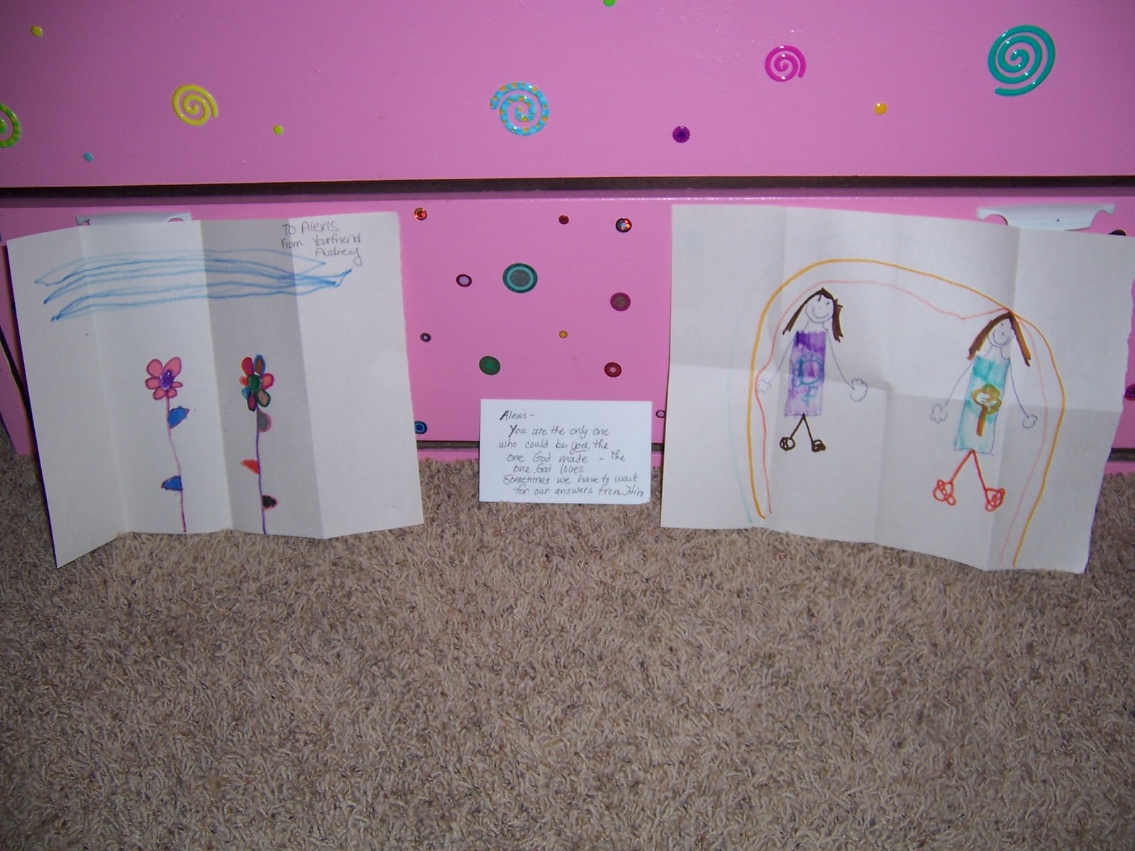 Look at that beautiful artwork!! Thank you to two special girls.. you know who you are!!! The note in the middle has the most encouraging words for our daughter. Thank you so much to the person who wrote these, I know she will be blessed by your kind words and the truth in them!